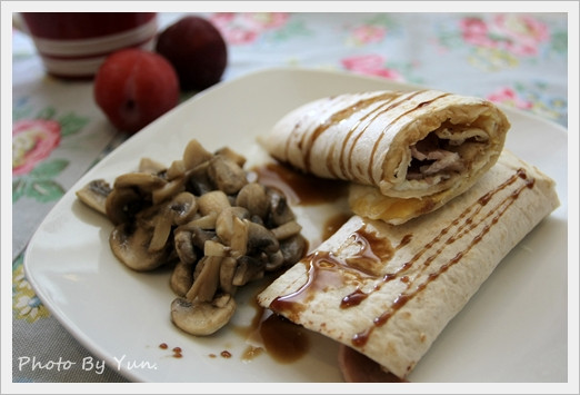 現在中午自己在家,通常都吃得很簡單~看著剩下的2片捲餅,和冰箱僅剩的培根和蘑菇,就湊合他們當作今天的午餐好了!!