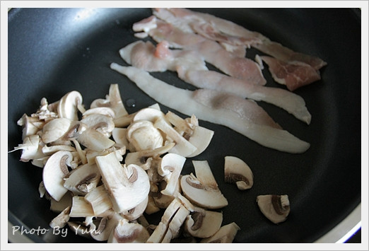順手洗了一些磨菇當邊菜配著吃,培根和蘑菇一人一邊先下鍋煎,我用不沾鍋所以沒放油!