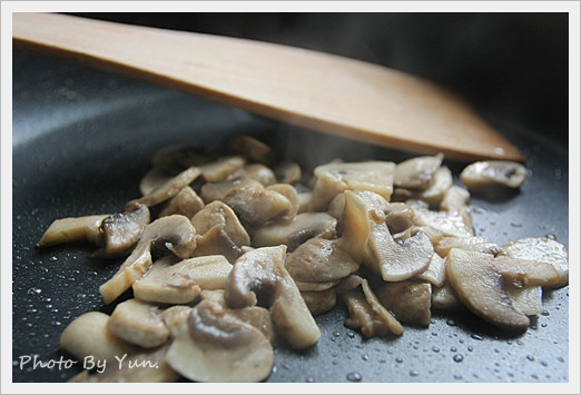培根煎好後先夾起來放,用培根油把磨菇炒軟,ok放旁邊.