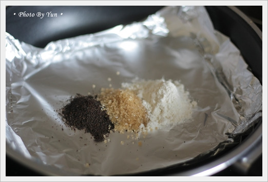 準備鍋子! 底下鋪兩張鋁箔紙~灑上茶葉、糖、麵粉,稍微拌一拌就好~