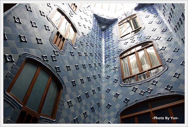著名的藍色天井,配合光線照射,越下面的開窗越大(好像可愛版的骷髏頭),越往下磁磚顏色越淺、開窗越大,讓房間更明亮!由下往上看整個天井的時候,就好像身處在大海水波之中! 賣紀念品處,也有賣這菱形的小磁磚菸灰缸,好可愛。在西班牙,參觀高地的作品,其實我覺得沒有很便宜捏!但是大多都是富有導覽的,Casa Batllo甚至也有中文導覽,透過導覽解說,往往會很驚喜的發現一些我原來完全不會發現的小細節,讓人得以窺見大師的想法!