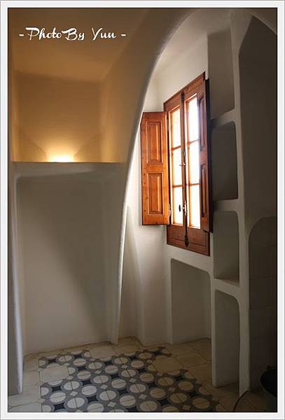 1 樓內部,重點是螺旋狀的漩渦天花板連接到柱子,另一個精彩之處是面對馬路的弧形波浪邊緣開窗,及上方大小不一圓形的彩色玻璃。 光線透過淡色的彩色玻璃,室內光變的好柔和! 這個空間,以前算是巴特婁家庭成員的公共空間(現代稱之為:客廳!),所以設計成有活動隔間的喔!人多party的時候,可以隨時打開隔間!這個空間裡的窗框、門框、隔間,下方全都有設計了類似像百葉窗的通風系統,往上扳、往下扳,可以控制開關,讓空氣流通。高地真的不只是超有想像力、創造力,他其實是非常講究許多室內細節上的處理~