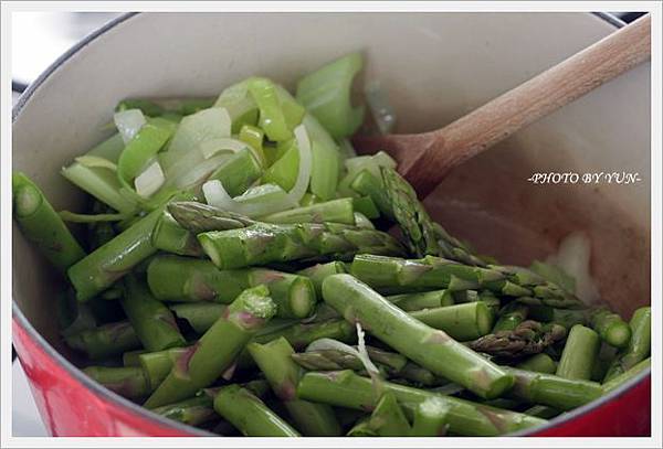 步驟三:加入蘆筍及高湯(雞湯塊或蔬菜湯塊均可),高湯約淹過食材1公分高。蓋鍋,小火煮約20分鐘或至食材熟軟。