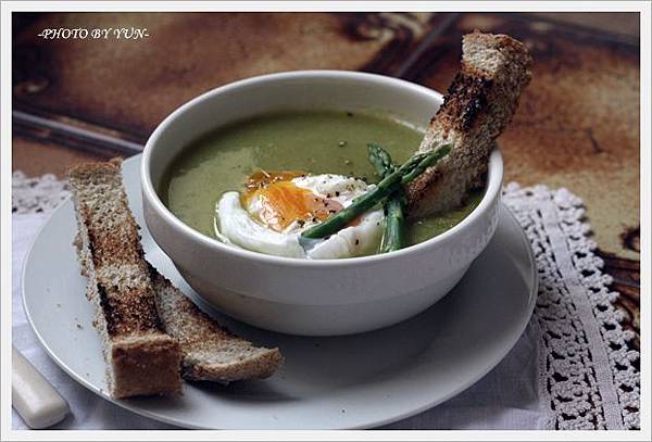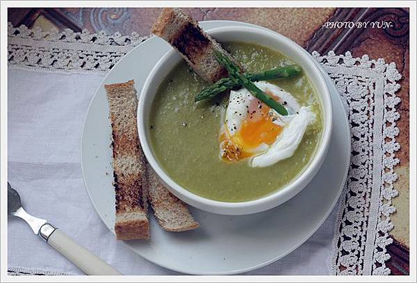 來英國三年了,居然現在是第一次試作傑米奧利佛的食譜! 好奇妙~雖然有它的食譜書,也總是鎖定他的節目,卻遲遲從未動手做過他的食譜。最近總是挑很簡單的濃湯料理來嘗試各種蔬菜組合的味道,終於有機會可以嘗試傑米的食譜,挑了soup食譜裡最簡單的蘆筍濃湯,加了顆半熟蛋的組合,好像飽足感又增添了不少耶!