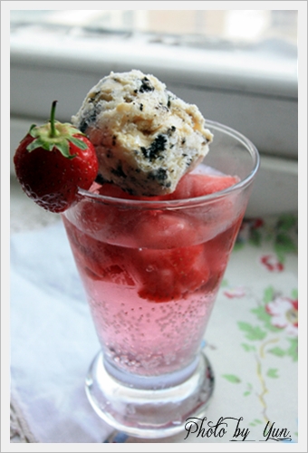 拿出透明的水杯,最好是比較高的,這樣才能看到漂亮的草莓冰塊~把水杯裝7分滿的草莓冰,在倒入汽泡水(我都是買超市沒有甜分的sparkling water)或是雪碧也ok!