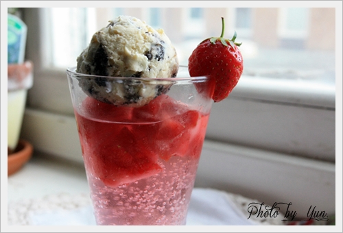 完成! 加上顆草莓和一顆哈根大茲冰淇淋~Perfect! 其實不加冰淇淋的話,也是一款很優秀的健康飲品捏~(化身為老王了...)因為不加糖,又是用新鮮水果,又有喝碳酸飲料的快感,真的是很一兼二顧阿!