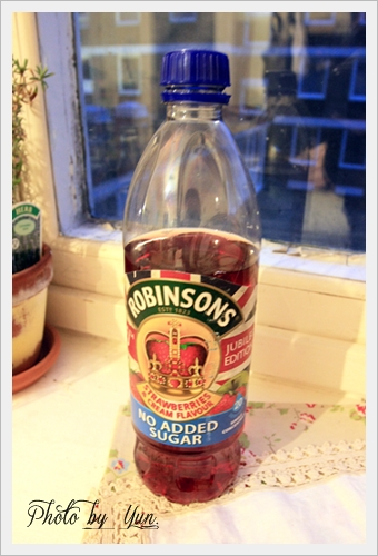 然後是這個~Robinsons的草莓濃縮果汁,這個偶爾遇到超市特價的時候會帶一瓶回家(英國人超愛喝濃縮果汁的... 平常很少喝,但三不五時會有突然很想喝甜的東西,我就會用這個調氣泡水~變草莓汽水喔! )
