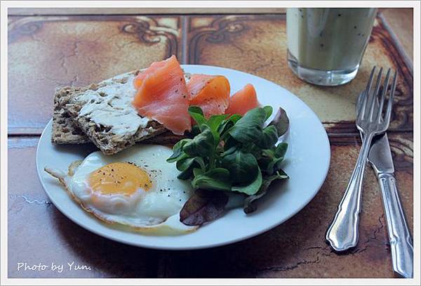 燻鮭魚要吃之前記得從冰箱提早拿出來,回復到常溫的鮭魚,會有比較溫潤的油脂感,也不會太冰冷。半熟太陽蛋則是煎單面,看見邊緣"有一點"焦焦的就熄火,讓蛋再熱鍋子裡多待一下,用餘溫讓蛋半熟就好。