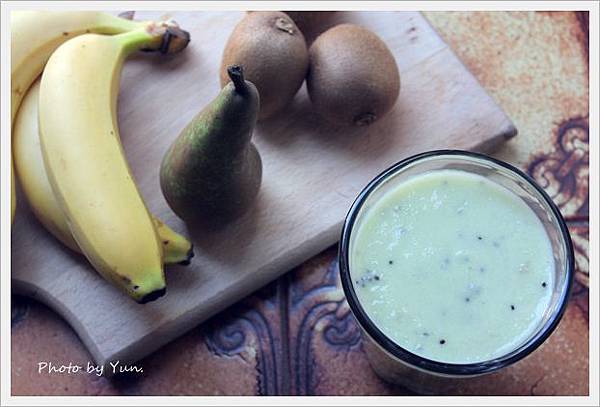 既然周末有空,那一定要打一杯果汁,補充一個星期的維他命! 而且多了一分綜合果汁,早餐也不自覺的"好像"有變比較高級捏!其實平常吃水果的時間比較少,但其實我很愛吃水果,所以打果汁是我一次可以攝取很多樣水果的方法~東切一點、西切一點,一下子就有3、4種水果。今天隨手拿了1根香蕉、1顆西洋梨、2顆奇異果,加150cc的牛奶,約莫是兩人份喔!