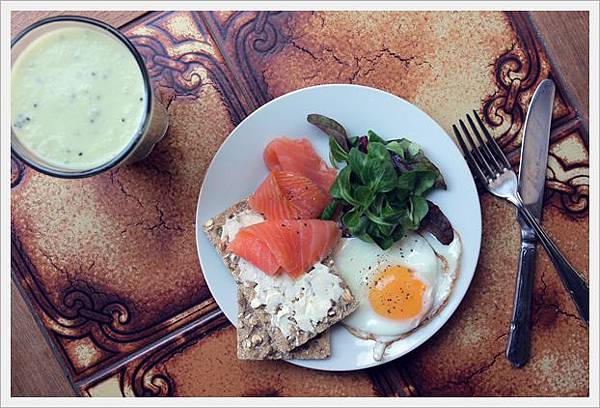 小脆餅抹上起司抹醬(cream cheese),簡單的搭上綜合沙拉菜、燻鮭魚、半熟荷包蛋,再打一杯smoothie。呼~還真想去樓下買份報紙來配早餐,而且一定要做在窗台邊....哈!