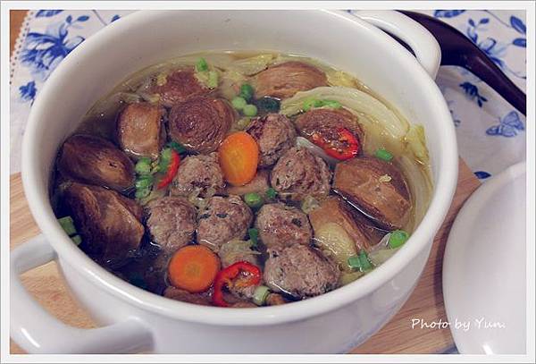 湯底煮好,就可以加入大白菜葉、肉丸子。同時加入調味料(鹽2tsb、米酒2tasp、醬油1tbsp)。水不用加多,我大約是食材的1/2的高度,大白菜熟了會縮很多喔!水過多就變煮湯了...