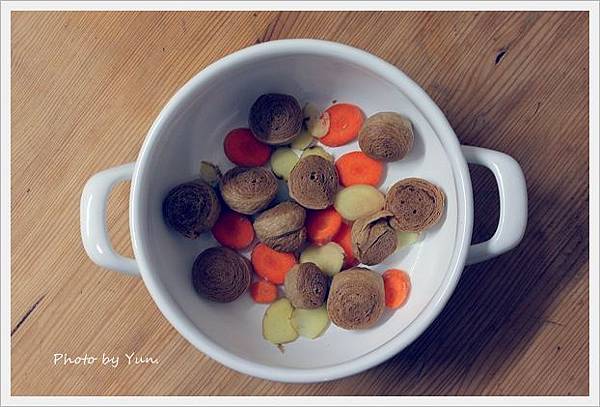 薑片、紅蘿蔔、加上珍藏的台灣豆輪,簡單的三樣食材就是今天的湯底。加水至稍微醃過豆輪的高度,小火滾約15-20分鐘,湯底帶有薑味和豆輪味,香的不得了!