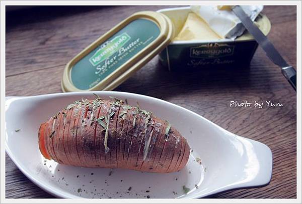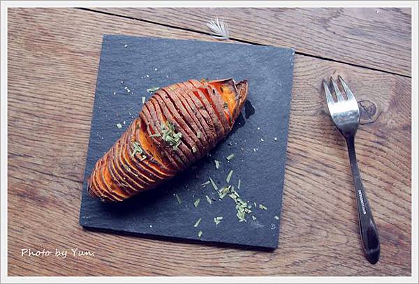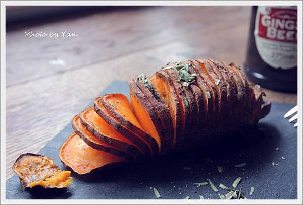 簡單的以奶油、鹽、tarragon調味。進烤箱200度c,約50分鐘!吃到的口感是邊緣酥脆,中間熟軟~很下酒耶!邊緣酥脆的表皮,還帶有淡淡的焦糖香喔~