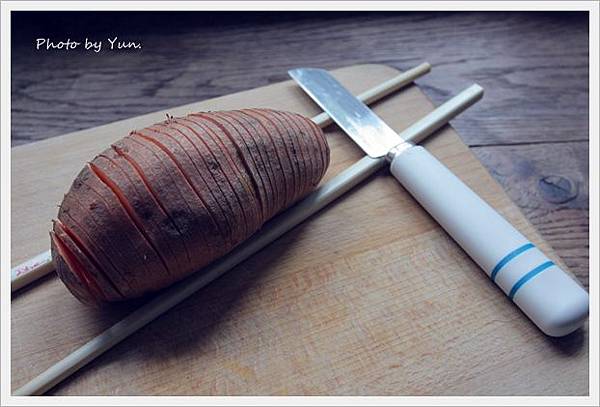 地瓜盡量挑從頭到尾粗細一致點的,因為雖說是完全簡單到不行的料理,但是還是有要求一些刀工的。在圓滾滾的地瓜下墊兩根筷子,這樣地瓜切片的時候就不會切到底,也就不會斷開。喜歡吃酥脆口感的人,可以盡量切薄一點。我大約每片0.5公分厚!