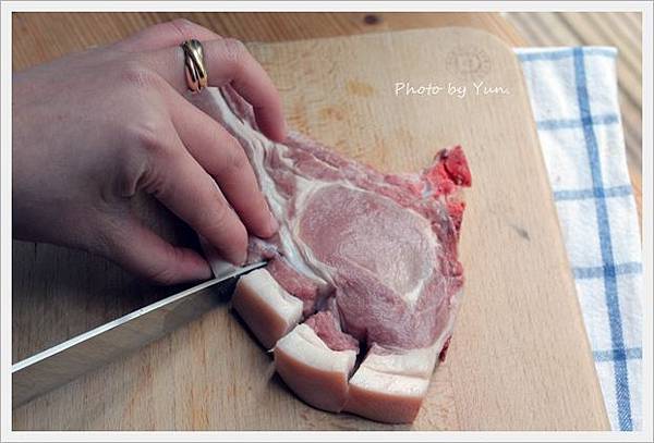 先再帶皮的這一邊,切約2公分深的橫紋,這個小技巧可以幫助這邊的肥油釋放出來,也可以讓豬皮變的脆脆QQ喔!(以上是Jamie說的)