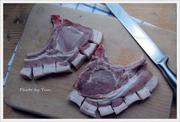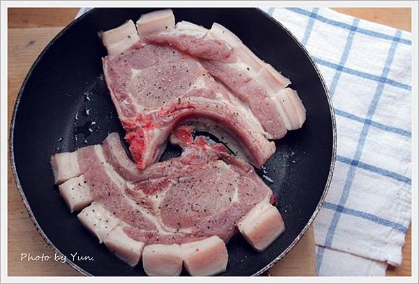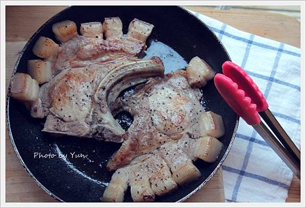 買pork chop的時候,不要被帶皮肥肉嚇到,這油脂可是美味來源。煎烤的過程裡油脂就通通被榨出了,也因為這些油脂,豬排可以保持軟嫩而不至於乾柴喔~豬排邊切好後,兩面灑些海鹽和磨點黑胡椒,就可以準備下鍋!