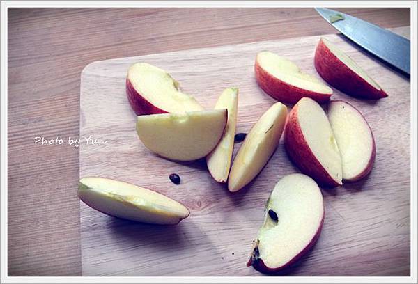 豬排備好。蘋果一顆切八段,把中間籽籽去掉。