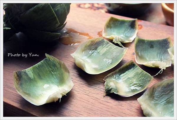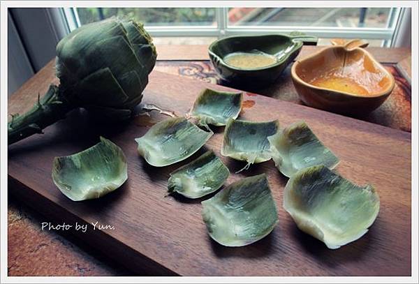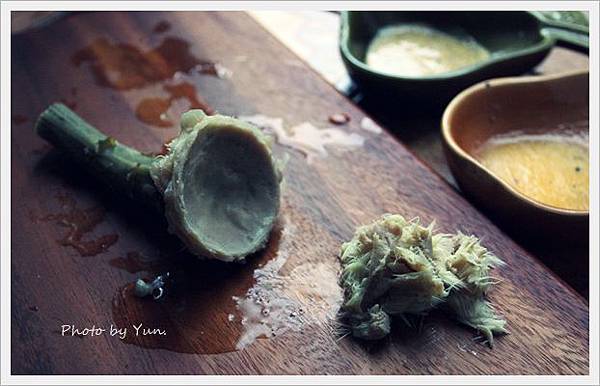 沾著吃的醬汁有兩款,一是融化奶油加鹽,二是蜂蜜芥末醬。一葉葉剝下來的樣子,能吃的其實只有尾端白白的地方。