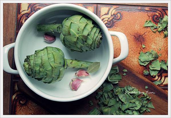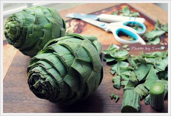 決定先用水煮。先用剪刀把葉尖厚厚的利角剪掉,頂端也可以先切掉一部分,但因為朝鮮薊葉片厚不好切,也就作罷!稍微修剪一下,意思意思~ 梗則是尾端較粗的部分切掉即可。