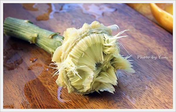 把細毛剝掉、刮乾淨,就是整株朝鮮薊最精華、最多料的地方了,把梗也剝一剝,終於可以吃稍微大口一點了啦!