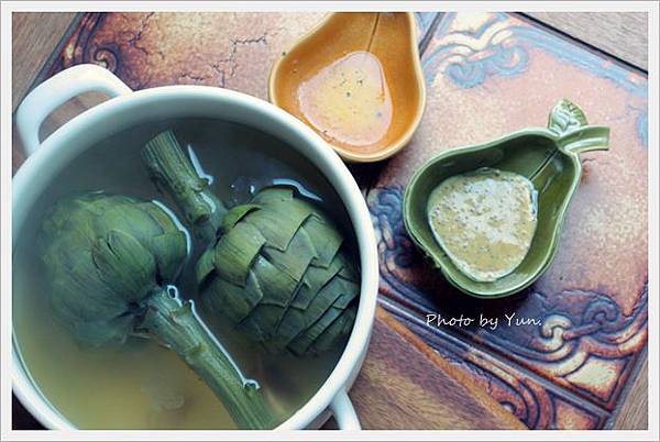 水滾後關小火,煮約20分鐘或筷子可以插過去。一直在想,煮完朝鮮薊的這鍋水,可不可以拿來當高湯或煮醬汁,因為好香! 沾著吃的醬汁有兩款,一是融化奶油加鹽,二是蜂蜜芥末醬。