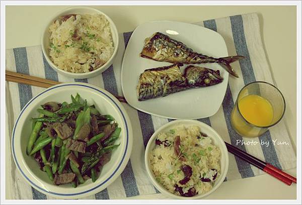 。鹽烤靖魚、蒜味牛肉炒蘆筍、肝臘腸炊飯。