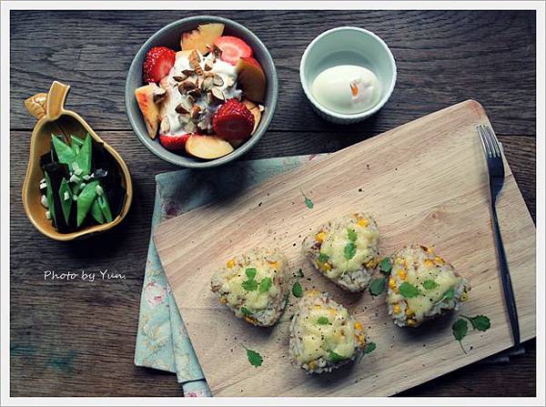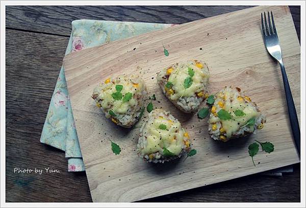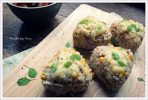 用前晚剩下的白飯,拌入鮪魚罐頭、玉米粒,調味一定要滴點香油或麻油,再看個人口味調整要不要加鹽。這次是用飯糰模子壓的飯糰,因為玉米粒比例太多了,手捏不好成型,用模子壓得緊緊的,飯糰緊實多了! 吃之前放點切達起司絲,放進烤箱烤個5分鐘,熱熱的起司飯糰,很適合微涼的春日早晨~(well...其實差不多也中午了啦.)