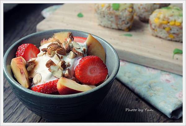 原來思考著應該要煮個味增湯的! (這樣才更有日式感阿~) 哈...終究還是順著自己的口腹之慾,給自己作了份水果優格。我很喜歡在英國買桃子吃,因為切開來的色澤很美,微脆的口感,卻帶著水蜜桃的粉紅色澤。水果優格上灑點杏仁果粒,好吃又健康!