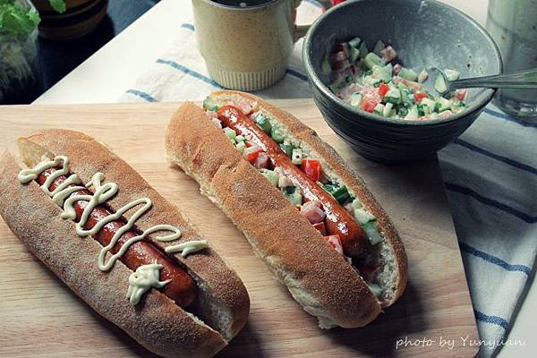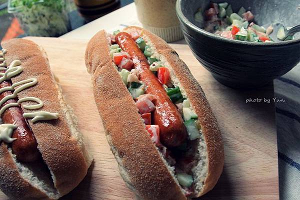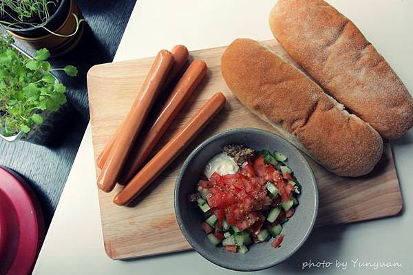 先用了全麥麵包,中間打算放兩條法蘭克福香腸。我的是稍為健康一點的路線,切了番茄丁和黃瓜丁,拌點美乃滋和芥末子醬。