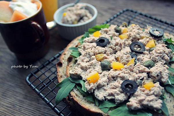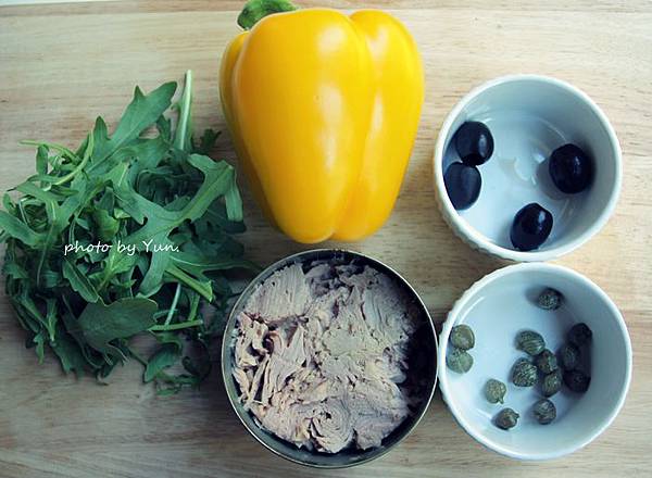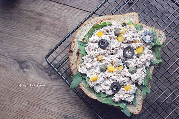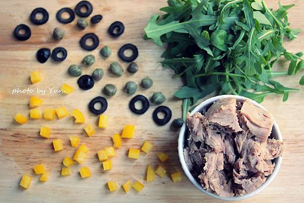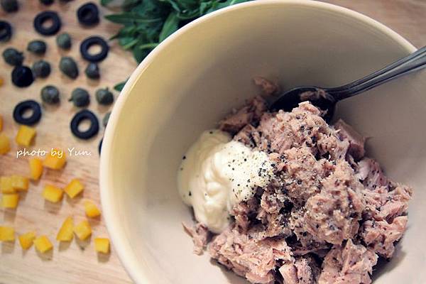 鮪魚加2匙美奶滋和黑胡椒,黑橄欖、酸豆、黃椒都切小小的就好。不用多,提味就好,主角還是鮪魚!