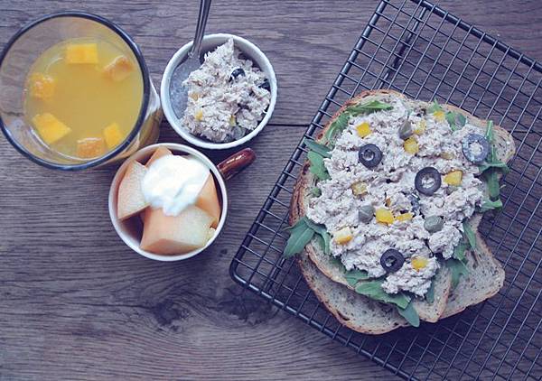 。鮪魚芝麻菜三明治/哈密瓜優格/芒果柳橙氣泡果汁。