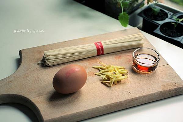 一人份的材料:一捆麵線、一顆蛋、一些薑絲、一大匙黑麻油