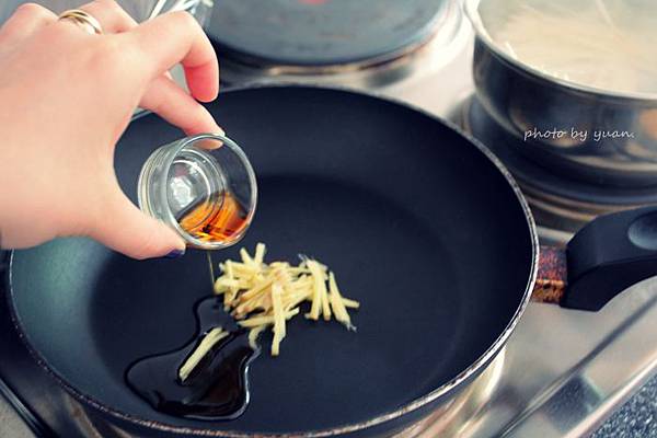 先用麻油把薑絲爆香。我都煎約5分鐘,煎到薑有點乾乾的。