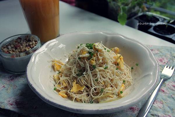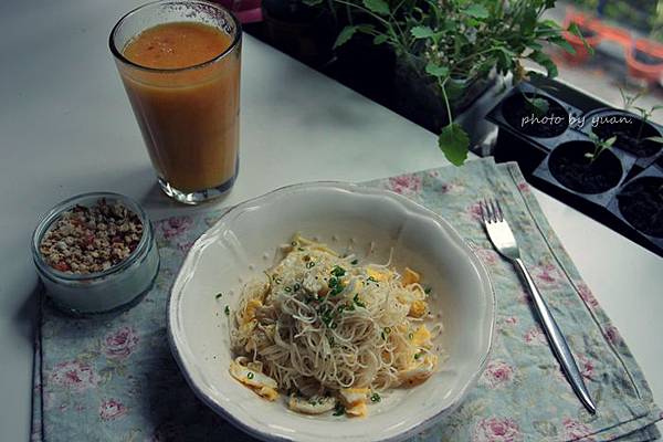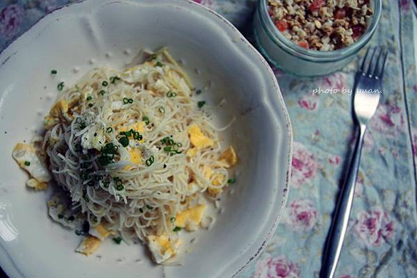 家裡沒有青蔥,切一點細香蔥(chives)也很搭~麵線也不會因為吸太多水而炒起來糊糊的,又油、又香、又好吃!一捆麵線一大盤的份量,再來杯果汁和一小碗榖片優格,又中又西的搭配,好想有點太隨興了阿!!