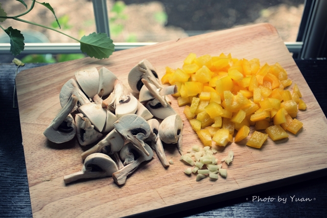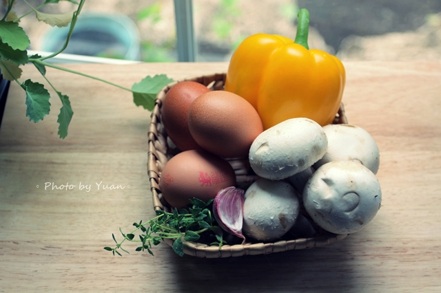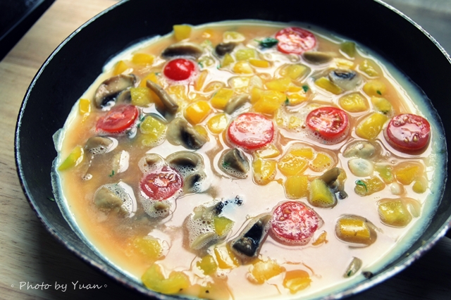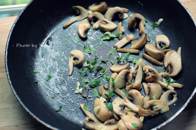 蒜頭和蘑菇先下鍋炒,大約表面開始有點濕潤、油量,就可以加入百里香和黃椒,再倒入蛋液。