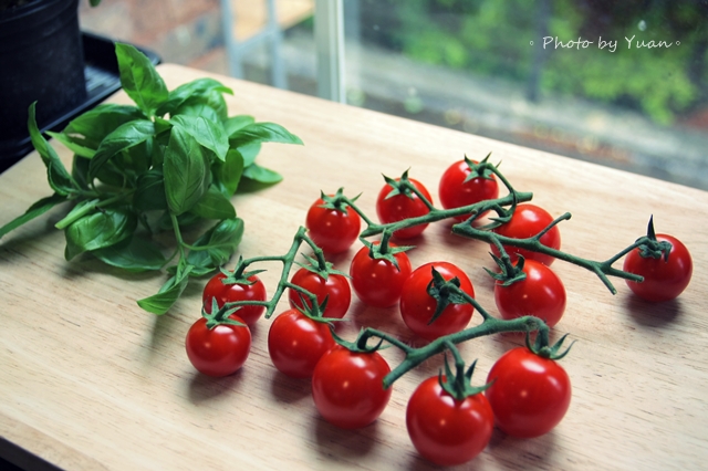 快手準備點盤邊沙拉,小番茄+羅勒洗乾淨就可以囉。