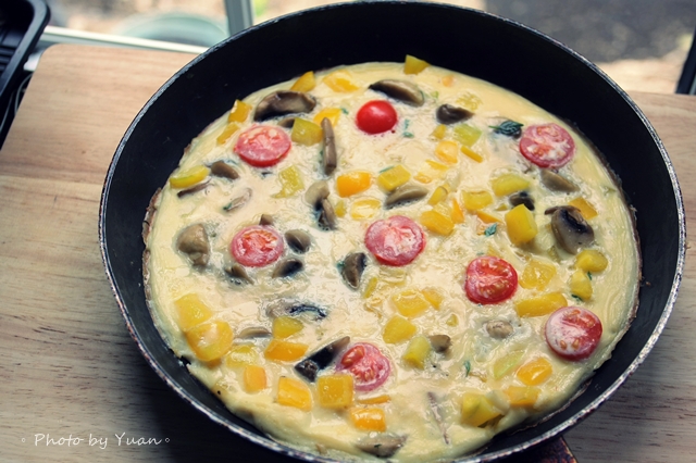 轉小火,讓歐姆蛋慢慢烘熟! 順手丟了幾個小番茄也很美耶! 底層歐姆蛋都差不多凝固了之後,這時拿個鍋蓋蓋著悶一下,表層的蛋液就會熟囉!