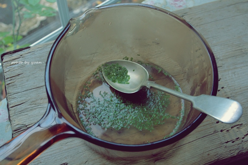 高湯30ml,先小火微煮細香蔥。別讓它滾喔!