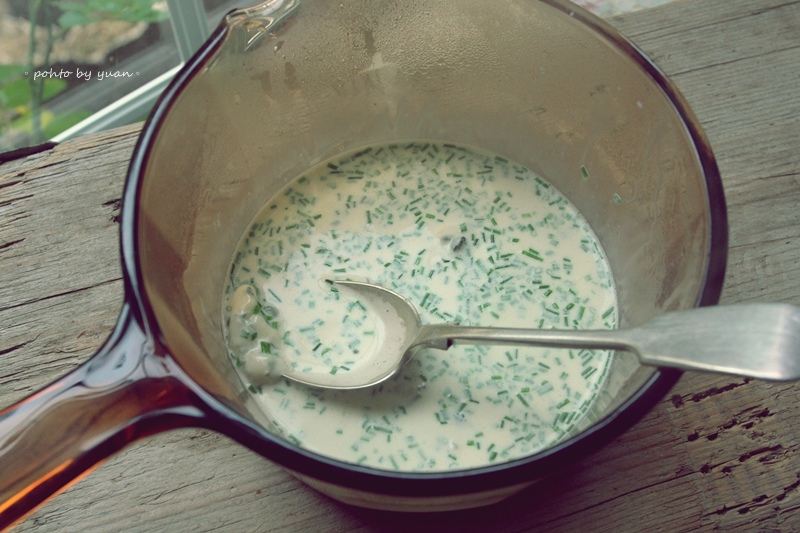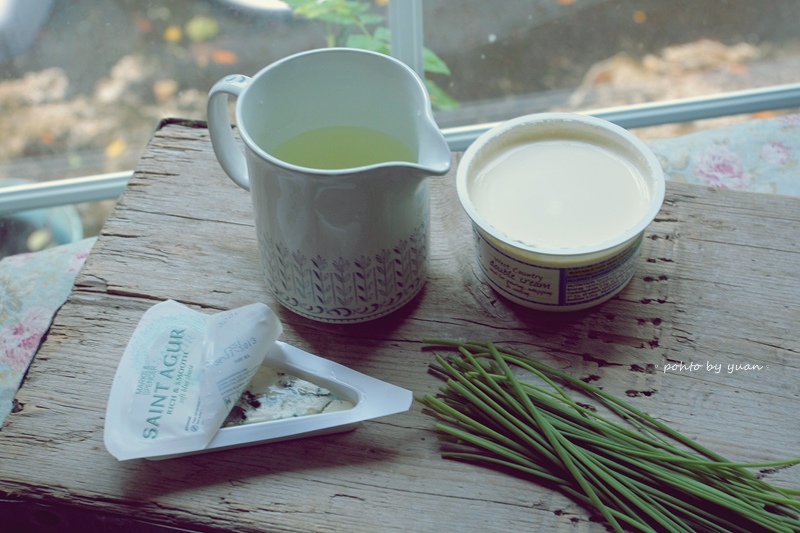 參考了各家食譜,簡化又簡化後,準備了高湯、鮮奶油、細香蔥和主角-藍起司。