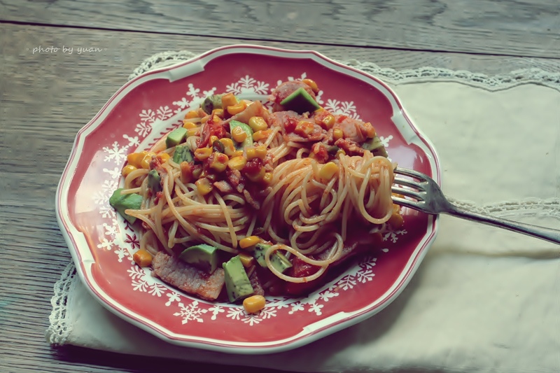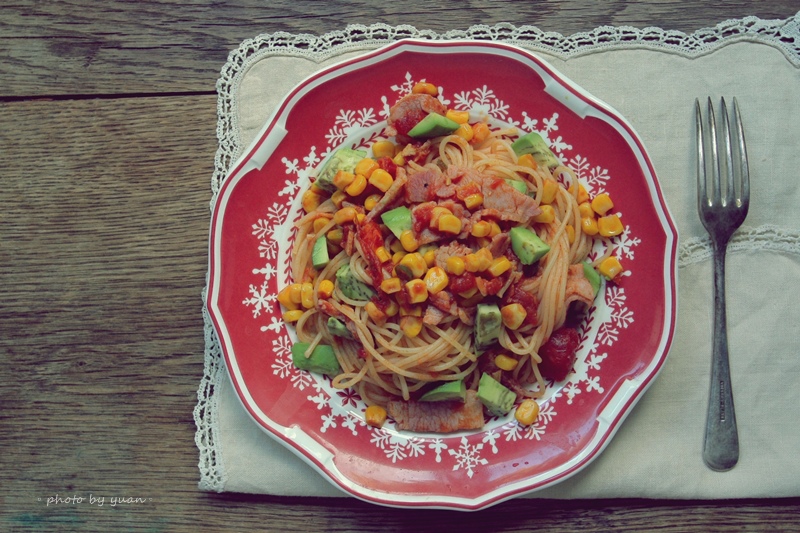 Spaghetti,是藍色包裝的DE CECCO 牌子,是我最常挑選的牌子! 從食物櫃裡拿出平常必備的番茄罐頭和玉米罐頭,培根3片、小辣椒兩根、蒜3瓣、酪梨一顆。(其實我另外很推薦小丁狀的煙熏培根,比較不鹹,烹調後依然帶有很清淡的煙熏味,我覺得比片狀培根好吃。下次拍照起來分享)