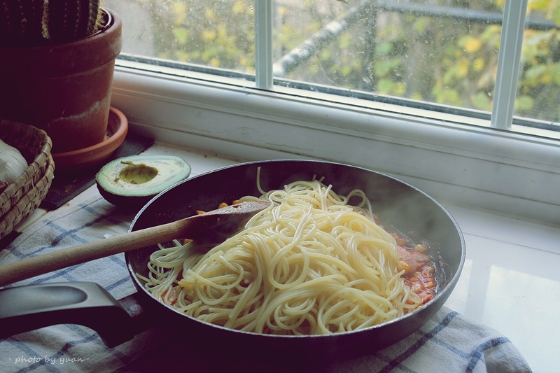 照包裝指示煮麵,撈起後加入醬汁裡你儂我儂一下,麵體會更入味。瀝麵時保留一些煮麵水,醬汁太乾或太少的話,可加一些煮麵水調整濃度。