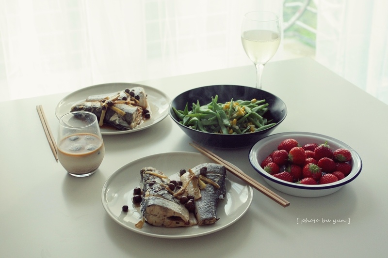 把魚放入平底鍋,加米酒、醬油、薑絲、破布子和一些些水,加蓋後開中小火慢煮即可,約10 分鐘後翻面。小心注意鍋裡的湯汁不要燒乾了,試情況加點水。 用筷子戳進魚肉看看,沒有粘黏就可以囉!上桌後,看著這盤中美味,週五夜的酒精魂又燃燒了。(開車不喝酒。)手癢心也癢的給自己倒了杯白酒佐餐,又中又西的,自己看著餐桌都想笑~ 不過,不能小看了這一尾魚的能耐,沒有白米當主食的這餐,一人一尾魚加上青菜、水果和飲品,其實分量很夠了!
