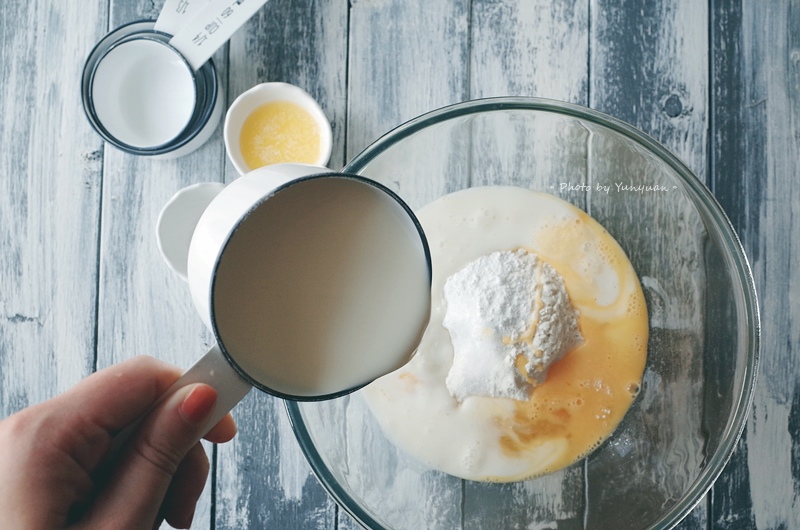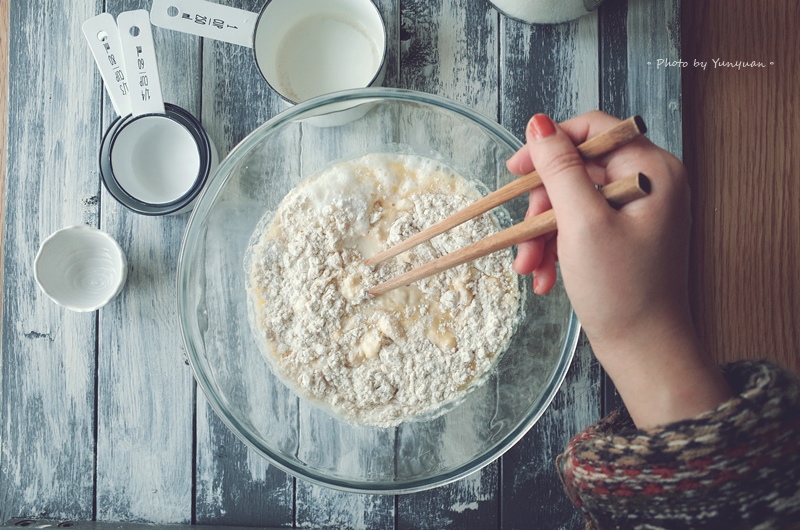 - 接著將濕料(牛奶、蛋液、奶油)倒入大碗中,以筷子輕輕拌勻麵糊。用筷子從左至右、從上到下的方式攪拌,遇到比較大塊的粉粒,可以用筷子夾破。總之攪拌次數越少越好,麵糊有一些疙瘩也沒關係。