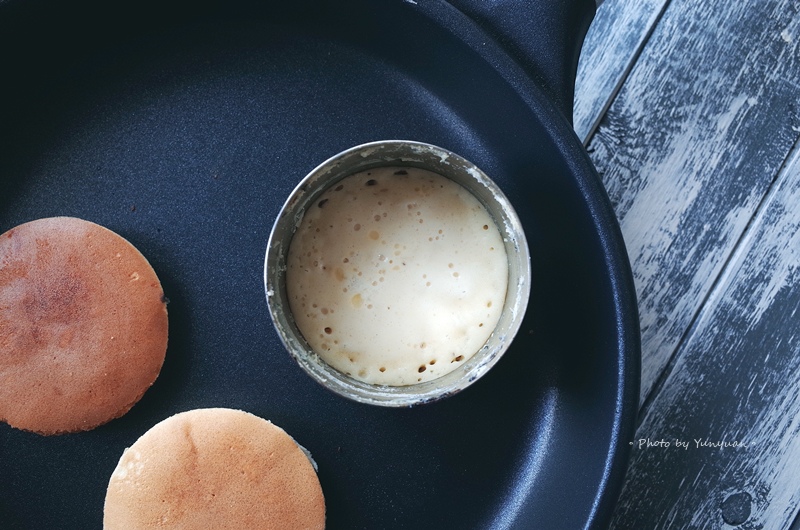 - 開中火,將鐵環輕放在鍋面上,不需要加油,直接倒入約0.5公分高的麵糊。(建議不要超過1公分厚)