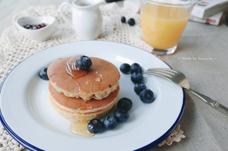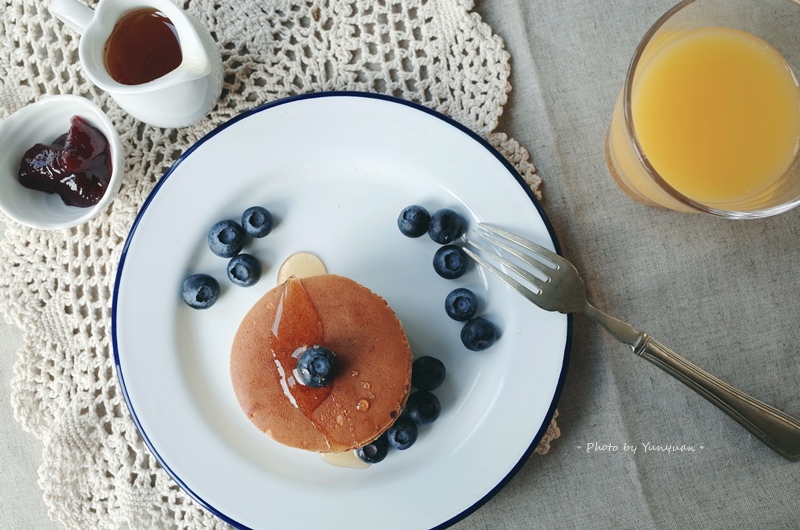 加進幾顆藍莓進鬆餅,有點爆開的藍莓果實為鬆餅帶來不同的花紋色澤。擺在一人份小盤上,小心擠上三朵奶油花、輕巧的撒上些巧克力粉,最後還得記得從窗台摘幾片小小的嫩薄荷,聶著手把薄荷葉插進奶油花裡。搭拉~跟著上桌的是一小壺甜蜜,是給對方的驚喜!