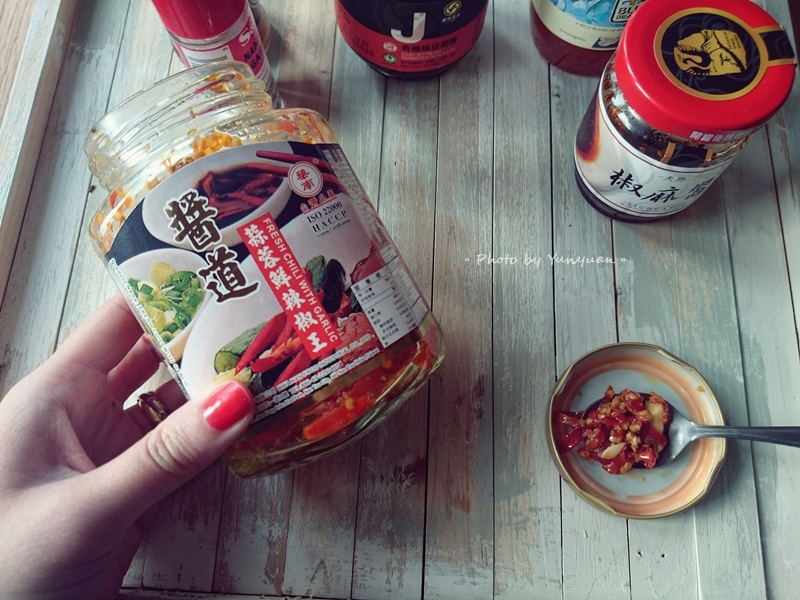 - 醬道蒜蓉辣椒王: 比較像是新鮮辣椒和蒜頭泡在辣油中,很辣很夠味! 在英國中國超市購入,是台灣生產的,適合當餃子沾醬或配湯麵。