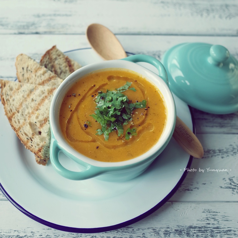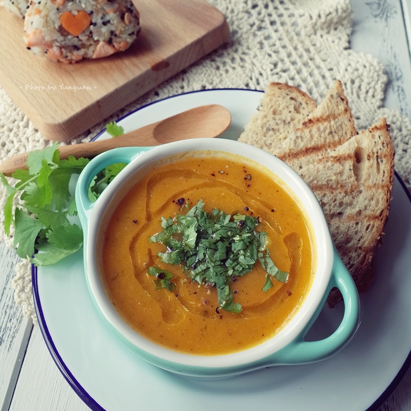 在部落格裡寫過好幾個不同版本的濃湯,香菜胡蘿蔔是第二次寫了(第一版)。這次是為五月份媽媽寶寶雜誌撰寫和攝影的三道孕期食譜:香菜胡蘿蔔、芝麻鮭魚飯糰、蘋果汁燉西洋梨。在這個版本的香菜胡蘿蔔濃湯裡,特地增加了地瓜這項食材,地瓜屬於粗纖維的食物,可以有效促進孕婦的腸胃蠕動。同時在濃湯中也提供天然甜味,減低了紅蘿蔔的草味。紅蘿蔔則含有豐富的胡蘿蔔素,具有抗氧化活性,可說是女性的飲食美容聖品,此外,其葉酸的含量也相當豐富,是胎兒神經發育的關鍵營養素。如果怕紅蘿蔔的人,不妨先試試提高一些地瓜的比例,香甜味更濃喔!