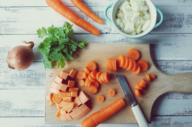 1.胡蘿蔔及地瓜洗淨後切成小塊。洋蔥切小丁。香菜切小段。