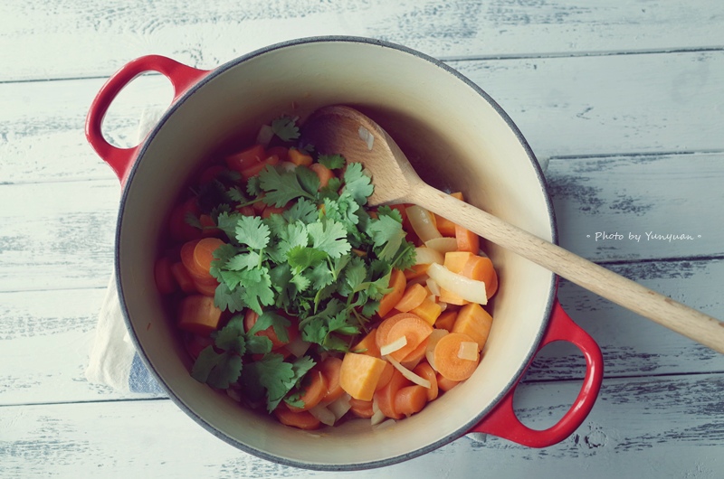 對我來說,我覺得這是道好樸實、極其家常的料理。就像是在微風徐徐的早晨,十分隨興從廚房的蔬菜籃裡,順手的抓出幾根紅蘿蔔、洋蔥等蔬菜,任意地把蔬菜切成塊,有大有小的,who care~ 但就是在這樣的平實料理裡,我們體會到了洋蔥、地瓜、胡蘿蔔的蔬菜自然香甜,也許不精緻亦不華麗,卻保證有最美好的滋味。
