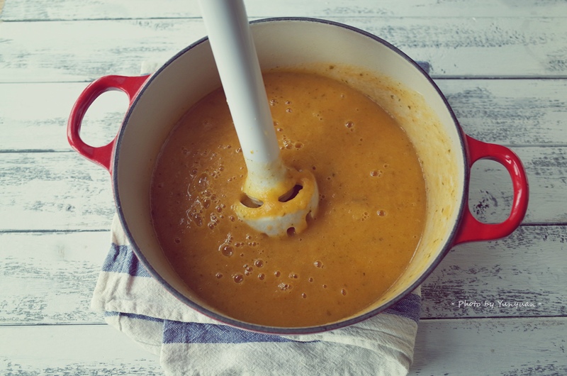 4.接著以攪拌棒或果汁機將蔬菜湯打成泥狀,加入開水調整濃稠度。食用前加熱即可。